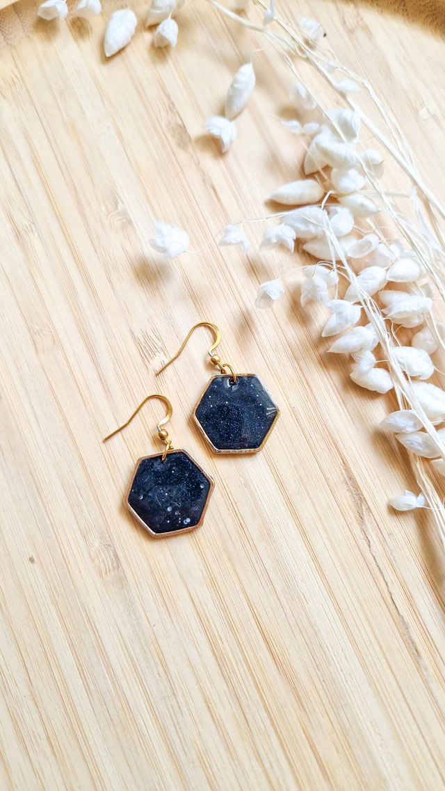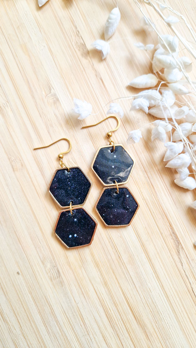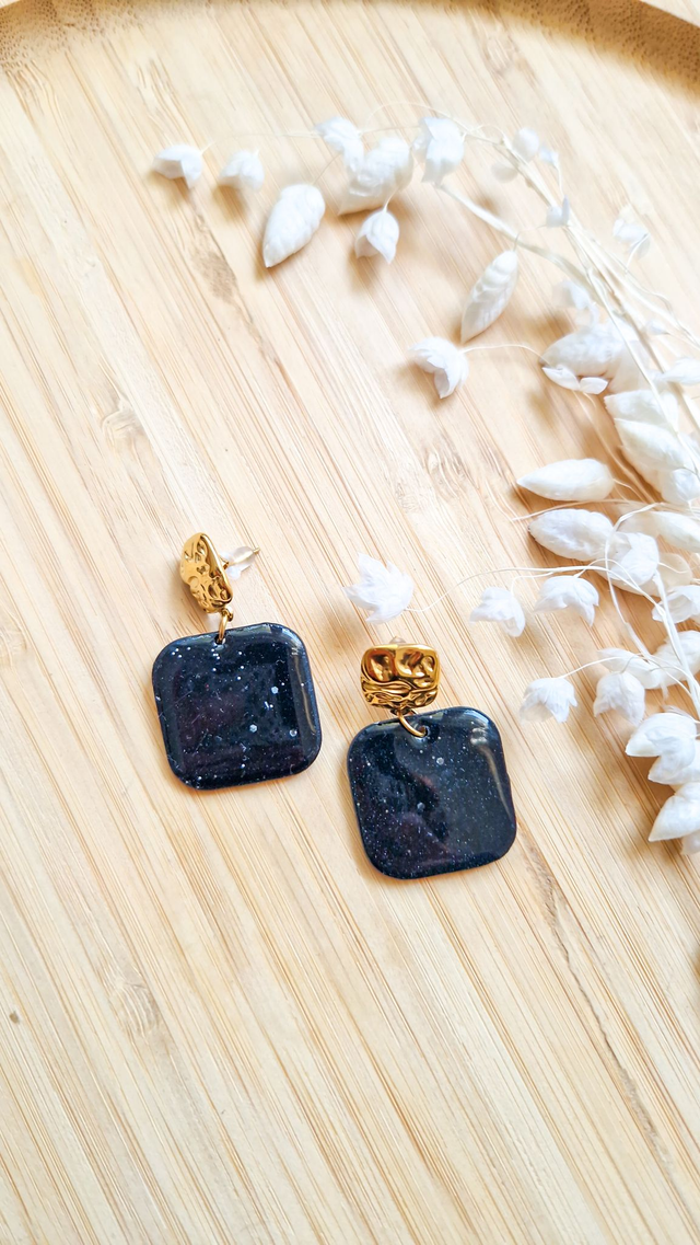 Noir Céleste - Boucles d'oreilles en pâte polymère et résine.